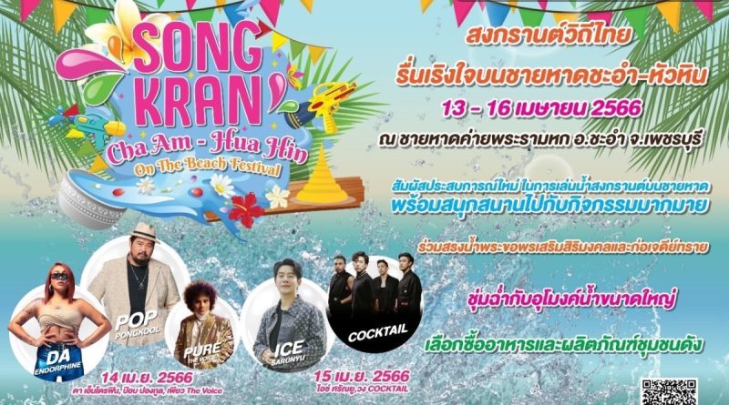 การท่องเที่ยวแห่งประเทศไทย (ททท.) ร่วมกับ กองบัญชาการตำรวจตระเวนชายแดน และบริษัท เพชรกะรัต คอร์ปอเรชั่น จำกัด จัดงาน Songkran Cha Am – Hua Hin on the Beach Festival สงกรานต์วิถีไทย รื่นเริงใจบนชายหาดชะอำ-หัวหิน ในวันที่ 13-16 เมษายน 2566 เวลา 16.00-23.00 น. ณ ชายหาดค่ายพระรามหก อ.ชะอำ จ.เพชรบุรี การจัดงานในครั้งนี้จัดขึ้น ในแนวคิด “Songkran on the Beach” ครั้งหนึ่งในชีวิตกับการเล่นน้ำสงกรานต์บนชายหาด โดยเลือกจัดงานในพื้นที่ชะอำ-หัวหิน ซึ่งเป็นแหล่งท่องเที่ยวชายทะเลที่สำคัญของจังหวัดเพชรบุรีและประจวบคีรีขันธ์ และยังเป็นเมืองท่องเที่ยวคู่แฝดการท่องเที่ยวชายทะเลที่นักท่องเที่ยวทั้งชาวไทยและชาวต่างชาตินิยมเดินทาง มาท่องเที่ยว