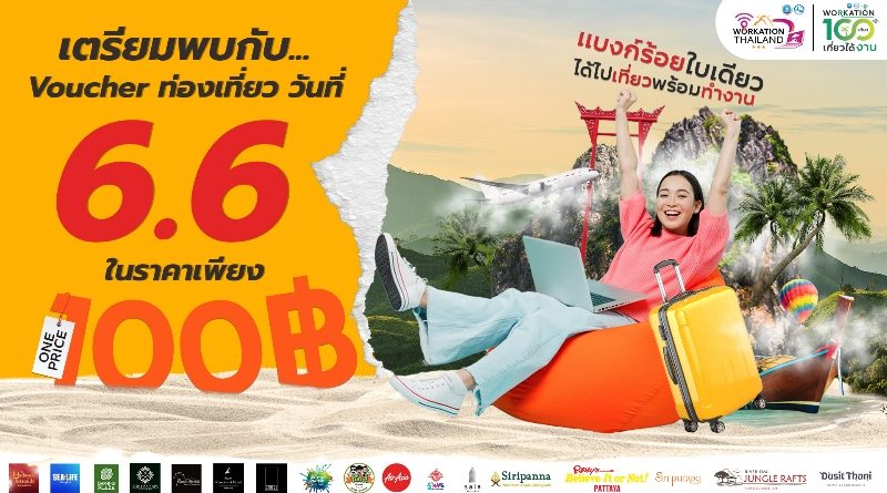 ททท. ลดกระหน่ำครั้งยิ่งใหญ่ กับ Voucher ท่องเที่ยวราคาพิเศษเพียง 100 บาท! ผ่านกิจกรรมส่งเสริมการขาย “Workation Thailand 100 เดียวเที่ยวได้งาน” เริ่มรอบแรกในวันที่ 6 เดือน 6
