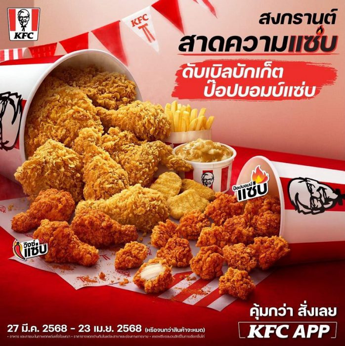 พบควันหลงความอร่อยโค้งสุดท้ายกับ ป๊อป บอมบ์ แซ่บ ได้ที่ KFC ทุกสาขา ถึง 23 เมษายน นี้ (หรือจนกว่าสินค้าจะหมด!) เท่านั้น ชุด เดอะบอกซ์ ป๊อปบอมบ์แซ่บ ราคาเพียง 159 บาท และชุด ดับเบิลบักเก็ต ป๊อปบอมบ์แซ่บ ราคา 399 บาท ติดตามข่าวสารกิจกรรมสุดพิเศษอื่นๆ ของ KFC Thailand ได้ที่ TikTok @kfcthailand, Instagram @kfcthailand, Facebook KFC Thailand และ X @KFCThailand