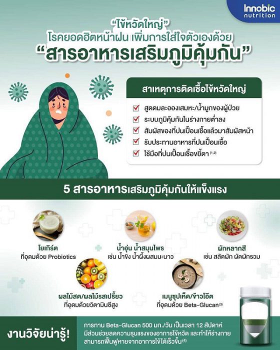 ในวันที่อากาศเปลี่ยนแปลงบ่อย เดี๋ยวร้อน เดี๋ยวฝน ปรับอุณภูมิกันแบบไม่ทัน ทำให้ป่วยเป็นหวัด หรือ เป็นภูมิแพ้อากาศได้ง่าย ยิ่งปล่อยให้ร่างกายสู้เพียงลำพังโดยไร้เกราะป้องกัน ก็ยิ่งทำให้ภูมิคุ้มกันต่ำลงส่งผลเสียต่อสุขภาพมากกว่าผลดี ยิ่งในวันที่อากาศชื้น ฝนตกโปรยปรายก็พาโรคภัยมาเยือนได้ตลอด โดยเฉพาะฝนแรกของฤดูจะดูดซับฝุ่นละออง เชื้อโรคที่ปนเปื้อนในอากาศลงมาด้วย เมื่อร่างกายสัมผัสน้ำฝนโดยตรงก็อาจทำให้ป่วยไข้ได้ง่าย การเสริมเกราะป้องกันให้ร่างกายจึงจำเป็นอย่างมากในทุก ๆ วัน โดยเฉพาะในวันทีฝนเทกระหน่ำ ถ้าร่างกายไม่พร้อมตั้งรับ ทั้งความชื้นและเชื้อโรค ก็จะกัดกินภูมิต้านทานของเราไปเรื่อย ๆ จนทำให้ป่วยในที่สุด เมื่อเชื้อโรคมีการพัฒนา เราก็ต้องสร้างภูมิคุ้มกันให้แข็งแรงมากกว่า เพื่อสู้กับโรคภัยไม่ให้มาแทรกแซงได้ง่ายๆ